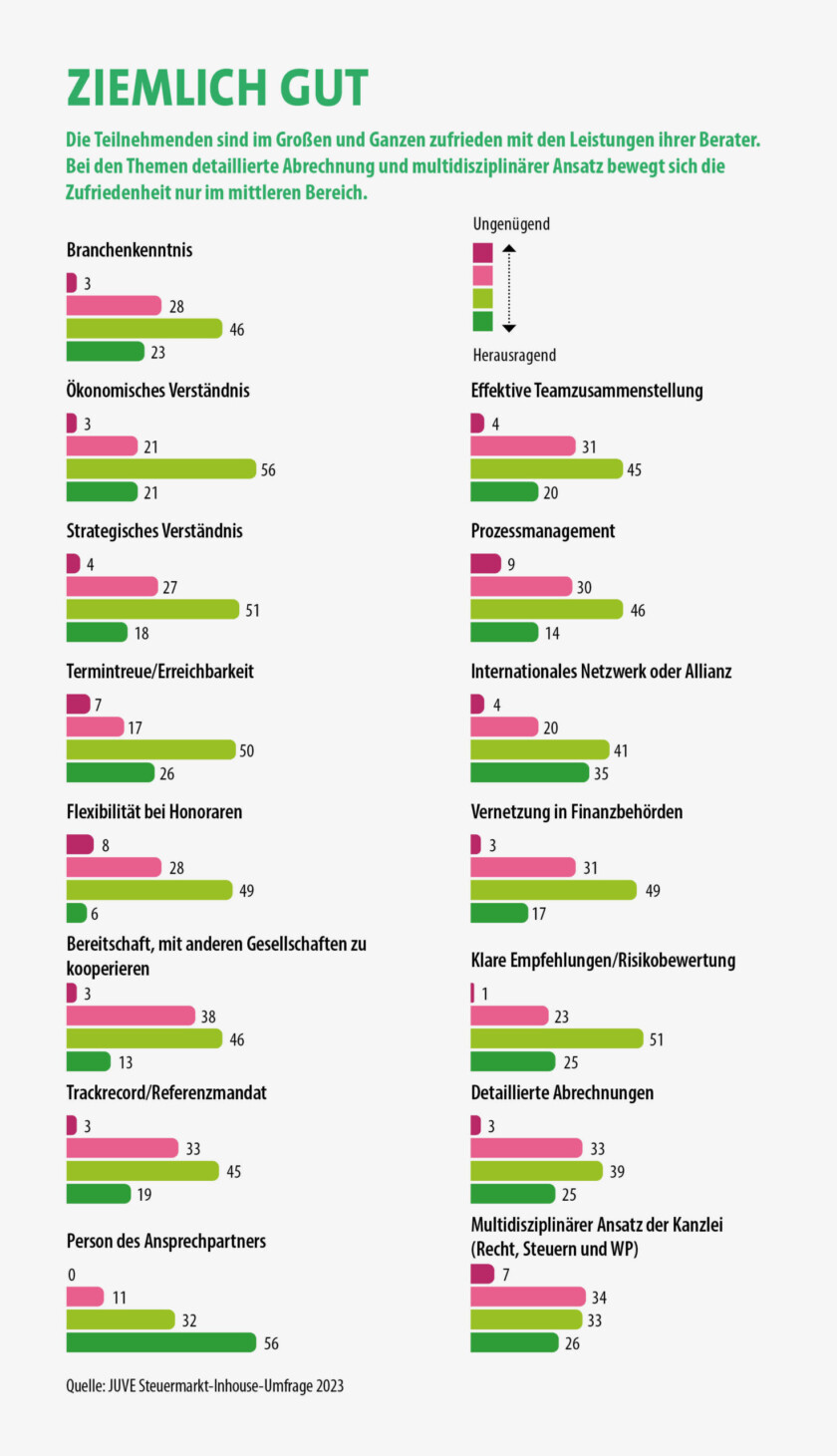 Und wie zufrieden sind die Teilnehmenden mit der Arbeit ihrer Berater? Bei den meisten von JUVE Steuermarkt abgefragten Zufriedenheitsfaktoren hat immerhin – mal etwas mehr, mal etwas weniger – die Hälfte die Tätigkeit der Berater als durchaus positiv bewertet. Besonders positiv heben die Mandanten dabei die Branchenkenntnis, das ökonomische und strategische Verständnis, die Termintreue beziehungsweise Erreichbarkeit und die Risikobewertung ihrer Berater hervor. Der größte Verbesserungsbedarf liegt laut JUVE Steuermarkt-Inhouse-Umfrage 2023 im Prozessmanagement und in der Bereitschaft der Berater, mit anderen Gesellschaften zu kooperieren. Aber selbst hier überwiegen die positiven Stimmen.