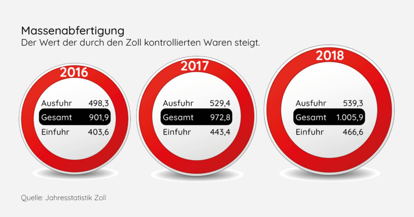 Zusätzliches Personal ist definitiv notwendig. 2018 registrierte der Zoll über 242 Millionen Warenabfertigungen – allein zwischen 2016 und 2018 kamen 33,9 Millionen Abfertigungen hinzu.