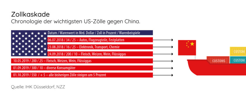 Seit mehr als eineinhalb Jahren überziehen sich die USA und China mit Sonderzöllen (Zollkaskade). US-Präsident Donald Trump hatte den Handelskonflikt losgetreten, um das aus seiner Sicht unverhältnismäßig hohe Handelsbilanzdefizit mit China zu verringern und Peking zu einer stärkeren Marktöffnung zu zwingen. Auf jede US-Zollerhöhung erfolgte postwendend eine Reaktion Chinas.