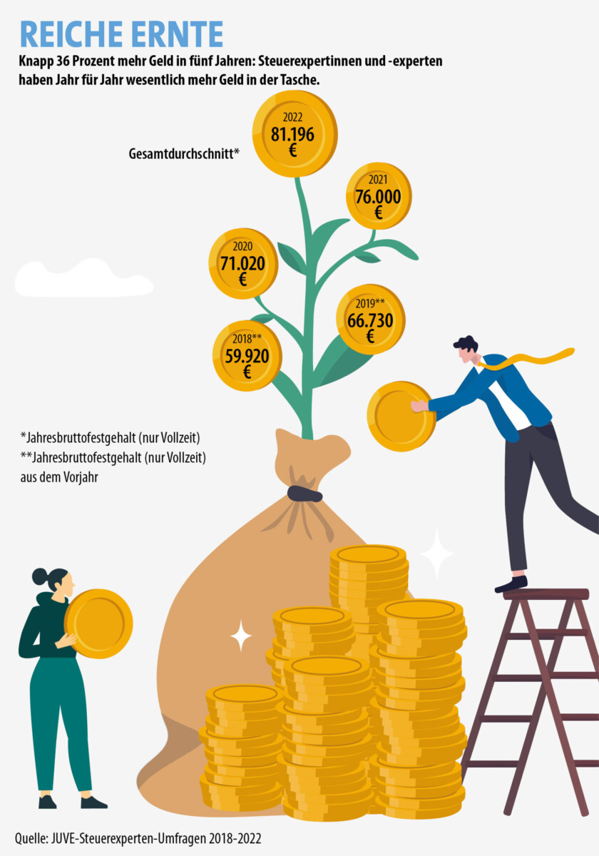 Zwischen Ende Mai und Anfang August 2022 hat JUVE Steuermarkt eine nicht repräsentative, anonyme Onlineumfrage unter Steuerexperten im Alter zwischen 20 und 65 Jahren durchgeführt. An der Umfrage nahmen rund 1.100 Menschen teil. Den kompletten Artikel sowie die Umfrageergebnisse im Detail zu Gehalt, Weiterbildung und Karriere, Work-Life-Balance und zur Methodik der Auswertung lesen Sie in der aktuellen Ausgabe JUVE Karriere Steuern die gerade erschienen ist. Alle Auswertungen finden Sie außerdem in unserem Benchmarking-Tool JUVE Plus.