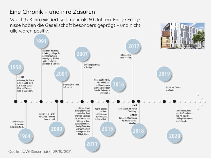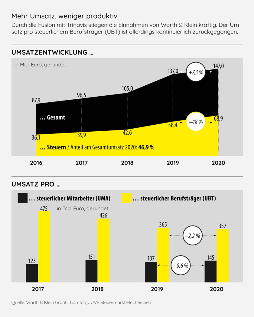 Der heutige Aufsichtsratsvorsitzende Riese nimmt zügig die Expansion in Angriff, eröffnet einen Standort in Berlin, geht eine Kooperation mit der Hanse Consulting ein und verstärkt die Rechtsberatung mit dem Kauf der Münchner Kanzlei Nachmann. Sein größter Coup gelingt ihm allerdings im Frühjahr 2019, als Warth & Klein bekannt gibt, mit der Berliner Gesellschaft Trinavis zu fusionieren. Die rund 300 Mitarbeiter starke und 25 Millionen Euro schwere Einheit gehörte laut Marktforschungsinstitut Lünendonk seinerzeit immerhin zu den 25 größten Wirtschaftsprüfungs- und Steuerberatungsgesellschaften hierzulande.