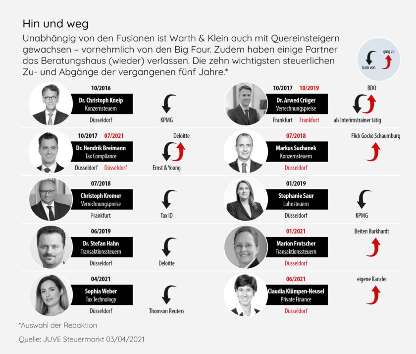 Mittlerweile gebe es drei Lager: die alte Warth & Klein-Garde, die Fusions-Zugänge und die Quereinsteiger, die hauptsächlich von den Big-Four-Gesellschaften kommen. Diese Konstellation spiegelt sich derzeit übrigens auch im Führungsgremium der Steuerberatung wider: Paul Forst ist ein Warth & Klein-Gewächs, Dr. Christoph Kneip und Stefanie Nattkämper-Scholz kamen von KPMG. Und Solveig Wickinger war vor der Fusion Teil von Trinavis.