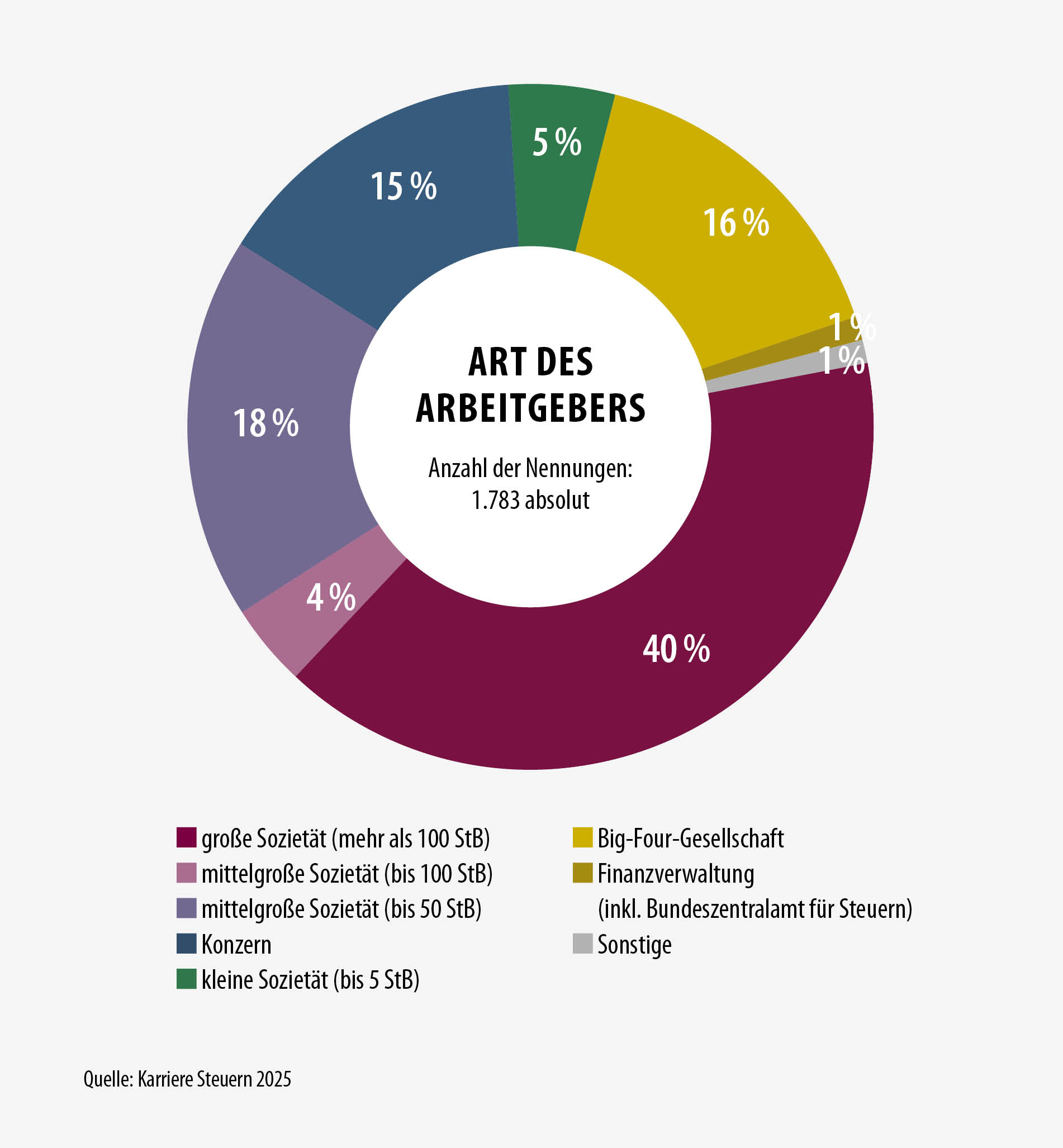 Die Umfrageteilnehmer wurden befragt, welche Organisation ihnen als steuerlicher Arbeitgeber bekannt sind – unabhängig von einer Bewertung dieses Arbeitgebers. Insgesamt gab es 2.380 Nennungen zu 237 verschiedenen Arbeitgebern. Die Antworten wurden prozentual gewichtet.