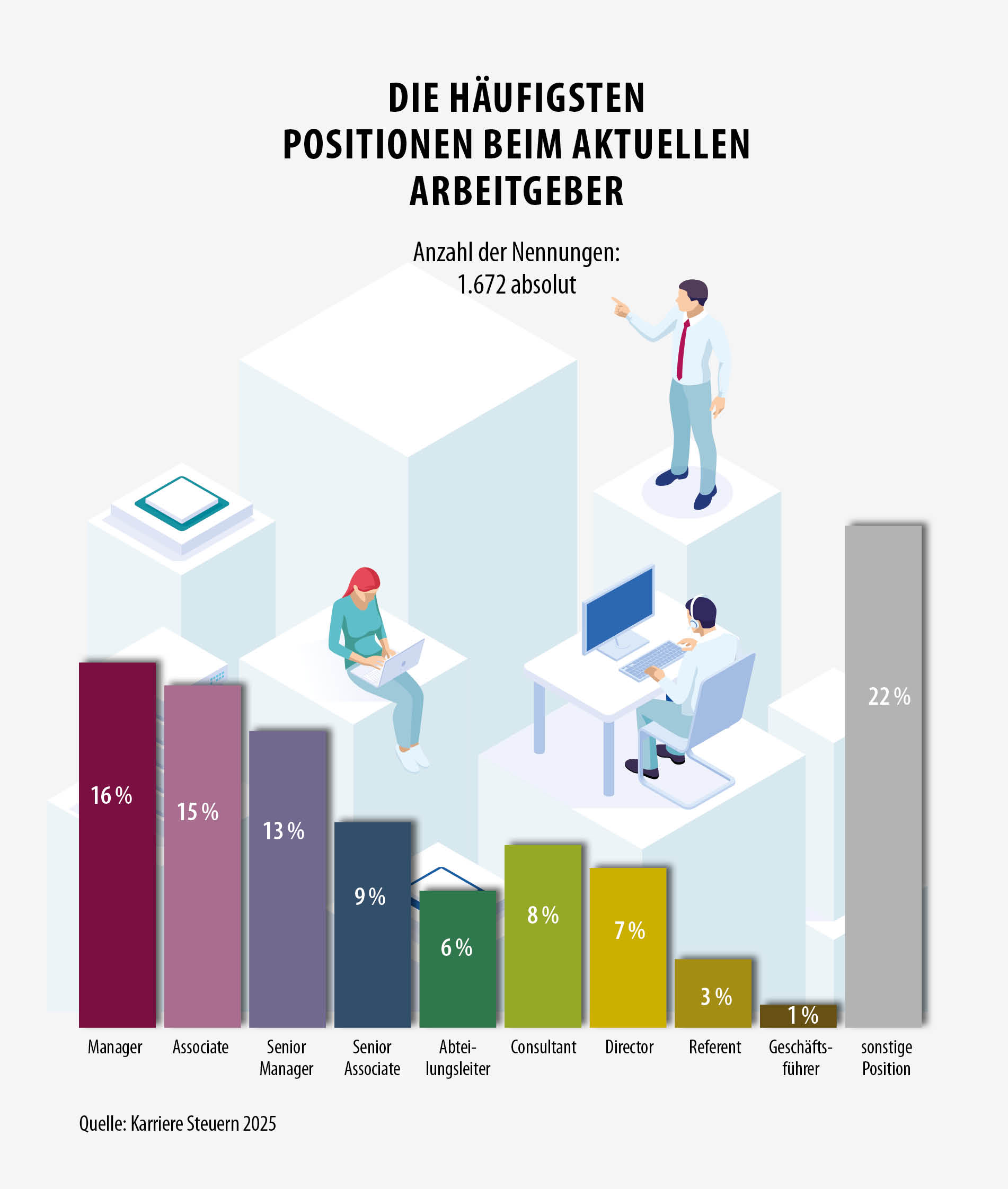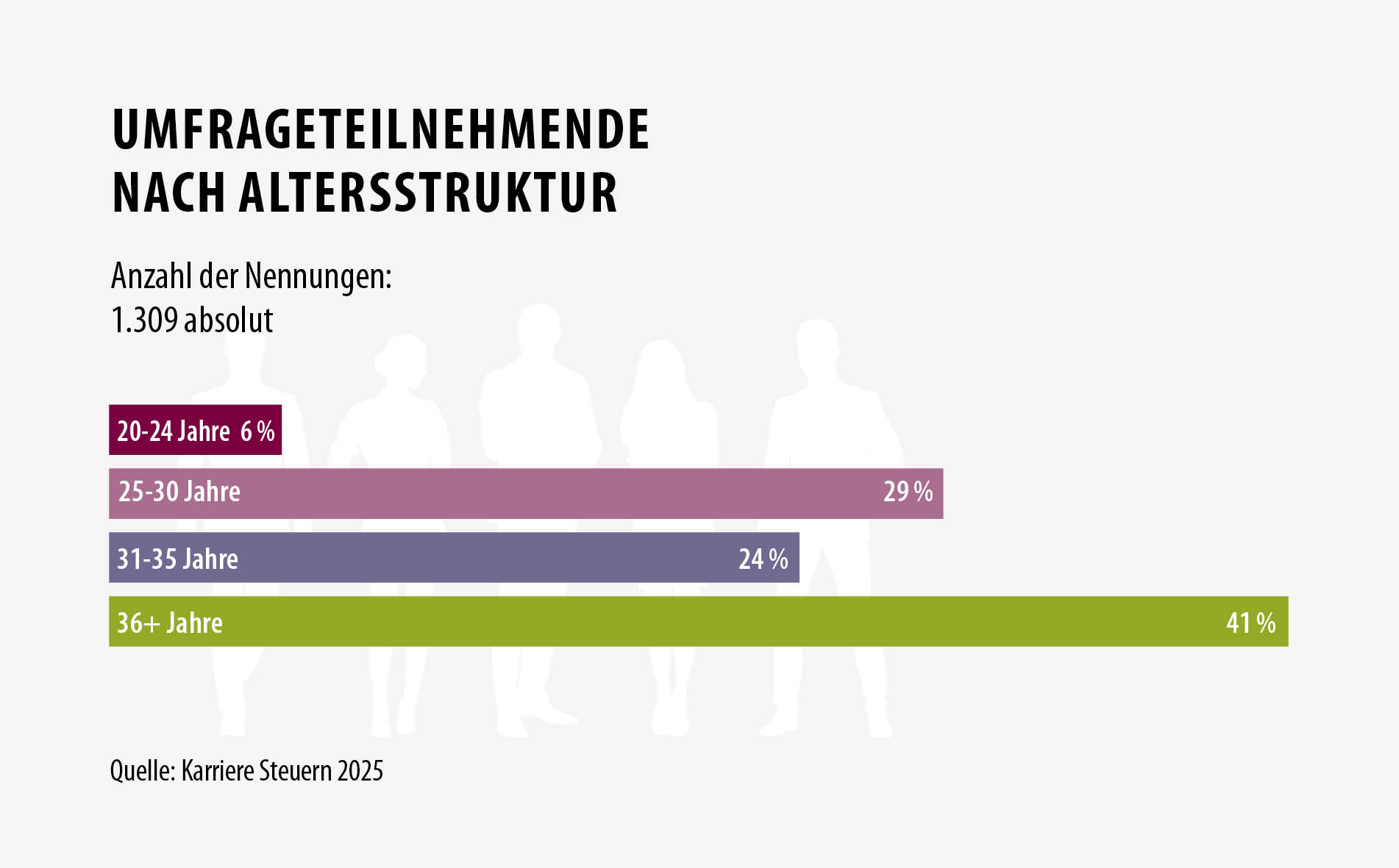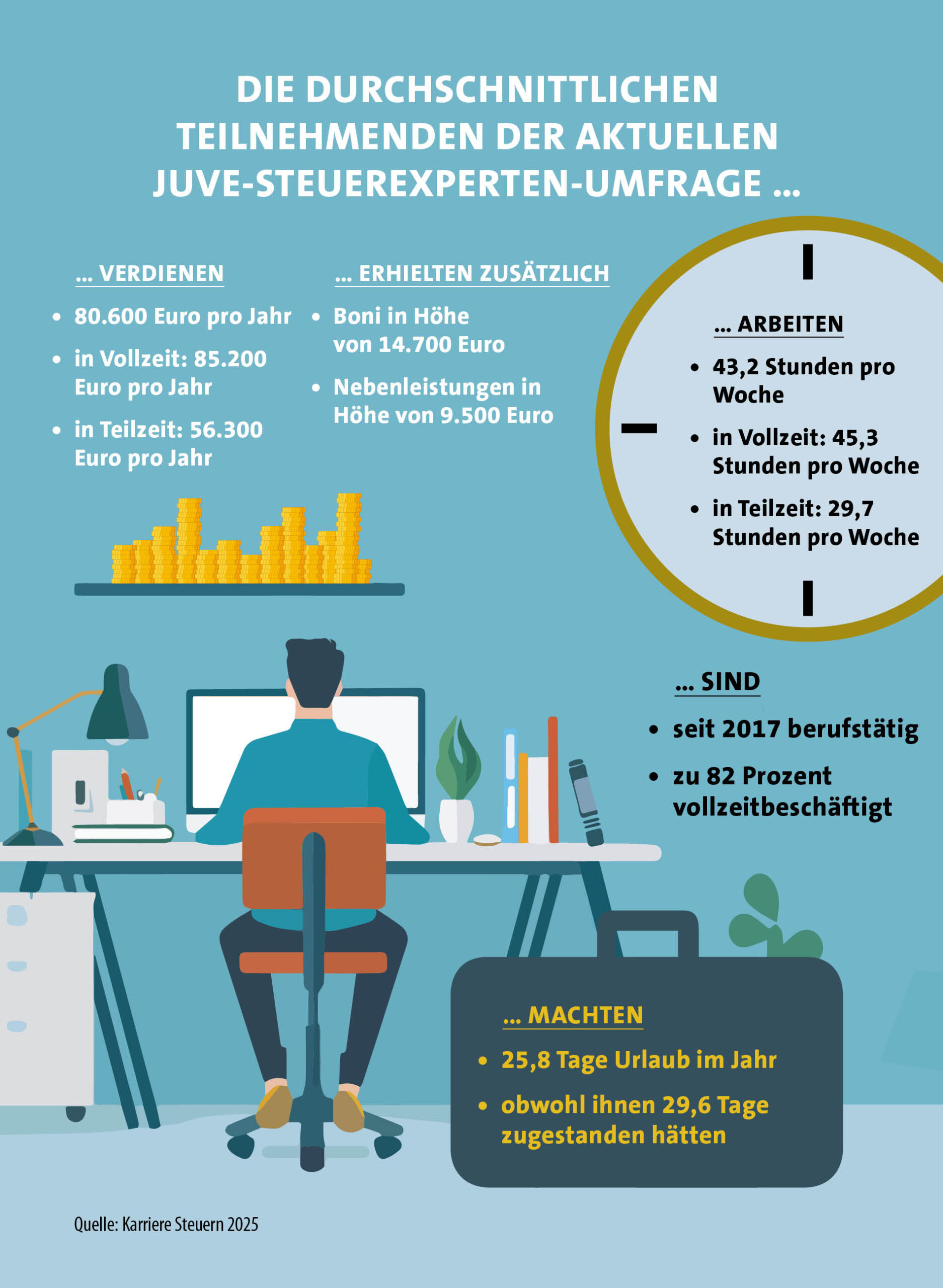 JUVE Steuermarkt hat zwischen Mitte April und Anfang Juli 2024 eine nicht repräsentative, anonyme Onlineumfrage unter Steuerexpertinnen und -experten im Alter zwischen 20 und 65 Jahren durchgeführt. An der Umfrage nahmen 2.078 Menschen teil. 1.818 Antworten waren qualifiziert auswertbar, darunter legten in 1.654 Fällen die Teilnehmenden auch ihren derzeitigen Arbeitgeber namentlich offen.