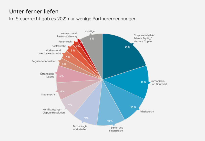 Von den 391 Ernennungen betrafen JUVE Recherchen zufolge im vergangenen Jahr nur 22 Steuerrechtlerinnen und Steuerrechtler, 2020 waren es fast doppelt so viele. Damit liegt das Steuerrecht nunmehr prozentual mit dem Öffentlichen Sektor gleichauf, der ebenfalls auf sechs Prozent der Ernennungen kommt. Zum Vergleich: Auf das Immobiliensteuerrecht entfielen 12 Prozent der Ernennungen, auf das Arbeitsrecht 10. Spitzenreiter ist das Beratungssegment Corporate/M&A/Private Equity/Venture Capital mit 21 Prozent der Partnerernennungen.