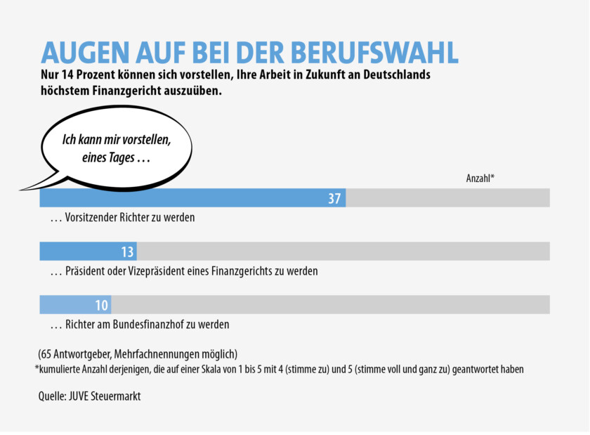 Einzig die Karrierechancen bleiben die Achillesferse an den Finanzgerichten. Das ist wenig verwunderlich: An einem Finanzgericht kann man Vorsitzender Richter oder Präsidentin werden. Doch diese Posten sind naturgemäß rar gesät. Laut Umfrage liebäugeln immerhin 60 Prozent mit dem Gedanken, einmal den Vorsitz eines Senats zu übernehmen. Rund ein Fünftel hat sich demnach zum Ziel gesetzt, eines Tages Präsident oder zumindest Vizepräsident zu werden. Durchaus überraschend: Nur 14 Prozent der Teilnehmenden können sich vorstellen, eines Tages Richter oder Richterin am Bundesfinanzhof (BFH) zu werden (>Augen auf bei der Berufswahl). Thomas Keß vom FG Niedersachsen findet dieses Ergebnis nicht so erstaunlich. „An einem Revisionsgericht handelt es sich durchaus um eine ganz andere Art der Arbeit“, sagt er. Zudem gibt es auch ganz banale Gründe, warum das Gros der Kollegen und Kolleginnen den Schritt an den BFH nicht als Wunsch angibt. „In den meisten Fällen dürfte es ja auch mit einem Umzug oder einer umfangreichen Reisetätigkeit verbunden sein. Und: Warum sollte man etwas aufgeben, mit dem man sehr zufrieden ist, für etwas, von dem man nicht weiß, wie erfüllend es denn sein wird?“