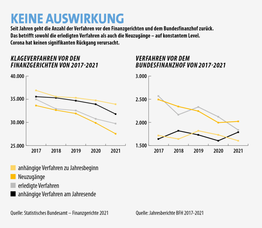Was man zudem schon seit Jahren beobachten kann: Die Verfahren vor den Finanzgerichten und dem Bundesfinanzhof gehen stetig zurück. Das betrifft sowohl die erledigten Verfahren als auch die Neuzugänge – auf konstantem Level (>Keine Auswirkung). Das bedeutet aber auch: Weder haben die Verfahren als Folge der Corona-Krise zugenommen – bislang zumindest. Einige Experten hatten vermutet, dass etwa Fragen zu Arbeitnehmerbesteuerung und Pendlerpauschale zu einer Zunahme von Verfahren führen. Noch kam es – wie von anderen erwartet – zu einer Delle der erledigten Fälle, weil die Gerichte aufgrund der Corona-Pandemie nur eingeschränkt handlungsfähig waren.