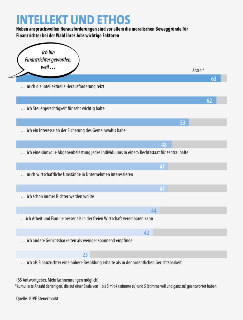 Tatsächlich spiegeln dies auch die Umfrageergebnisse wider: Neben der intellektuellen Herausforderung sind es demnach vor allem auch ethische Motive, welche die Teilnehmenden dazu bewegt haben, eine Karriere am Finanzgericht zu starten. So haben insgesamt 82 Prozent angegeben, dass sie „ein Interesse an der Sicherung des Gemeinwohls haben“ und satte 95 Prozent halten „Steuergerechtigkeit für sehr wichtig“ (>Intellekt und Ethos).