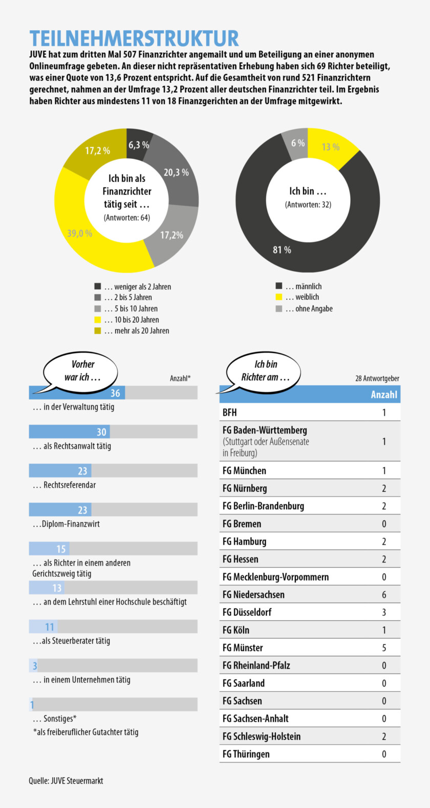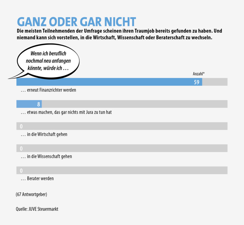 Und Keß steht mit dieser Einstellung nicht allein da. Das Gros der Finanzrichter jedenfalls scheint seinen Traumjob bereits gefunden zu haben. So zumindest lässt sich die JUVE Steuermarkt-Umfrage unter Deutschlands Finanzrichtern interpretieren. Demnach würden 88 Prozent der Teilnehmenden erneut ans Finanzgericht gehen, wenn sie die Möglichkeit hätten, beruflich noch einmal ganz neu anzufangen (>Ganz oder gar nicht).