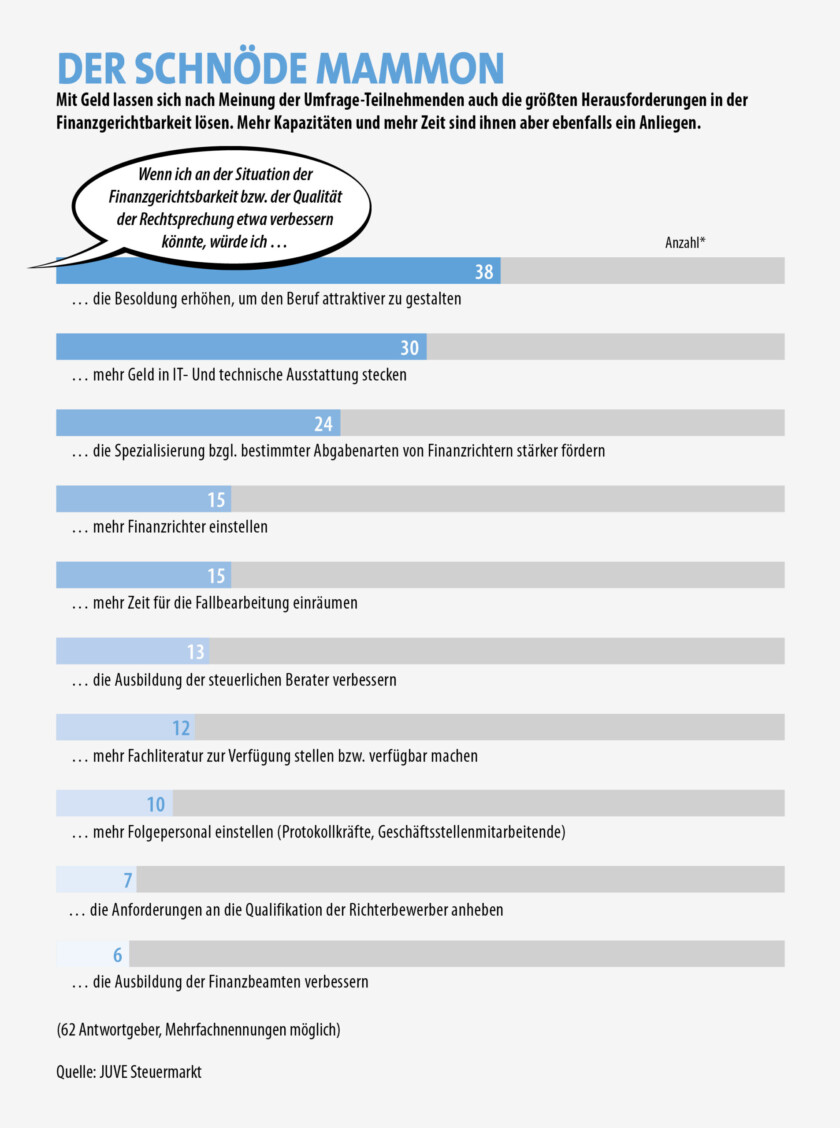 Doch Moral und Intellekt reichen am Ende dann doch nicht aus, um einen Finanzrichter zufriedenzustellen. Gemäß dem Motto „Wo gehobelt wird, fallen Späne“ sehen die Teilnehmenden der Umfrage in einigen Punkten durchaus auch Verbesserungspotenzial. Und ganz oben auf der Liste steht: der schnöde Mammon. Denn obwohl die Teilnehmenden mit ihrem Gehalt insgesamt zufrieden und in den vergangenen Jahren gar immer zufriedener geworden sind, haben immerhin 61 Prozent von ihnen angegeben, dass sie die Besoldung erhöhen würden, um den Beruf attraktiver zu machen (>Der schnöde Mammon).