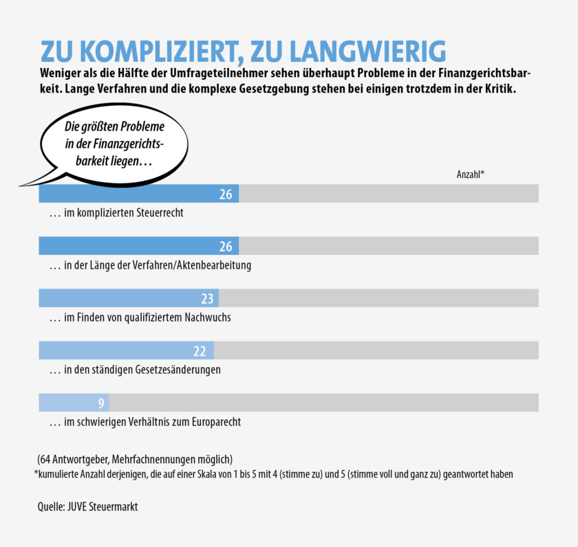 So gaben jeweils 40 Prozent der Teilnehmenden an, dass die größten Probleme der deutschen Gerichtsbarkeit „im komplizierten Steuerrecht“ liegen und immerhin 35 Prozent sehen das größte Problem in den „ständigen Gesetzesänderungen“ (>zu kompliziert, zu langwierig). Für Thomas Keß vom FG Niedersachsen sind dies durchaus überraschende Ergebnisse. „Dass wir uns mit kompliziertem Steuerrecht auseinandersetzen, gehört ja nun mal zu unserem Job“, sagt er. „Genauso wie Gesetzesänderungen, die sicherlich eine deutlich größere Herausforderung für die Berater als für die Richter darstellen, da diese sich umgehend mit ihnen befassen und auf sie reagieren müssen.“ In eine ähnliche Kerbe schlägt Krebbers vom FG Düsseldorf. „Das ist ja nicht so, um uns bei Laune zu halten oder zu beschäftigen“, sagt er augenzwinkernd. „Vielmehr verfolgt der Gesetzgeber damit – wenn auch nicht immer erfolgreich – eine vermeintlich größtmöglich faire Aufteilung der Steuerlast“, erklärt er. „Außerdem orientiert sich das Steuerrecht an gesellschaftlichen und wirtschaftlichen Wandlungen und Entwicklungen, das macht unseren Beruf ja so spannend.“