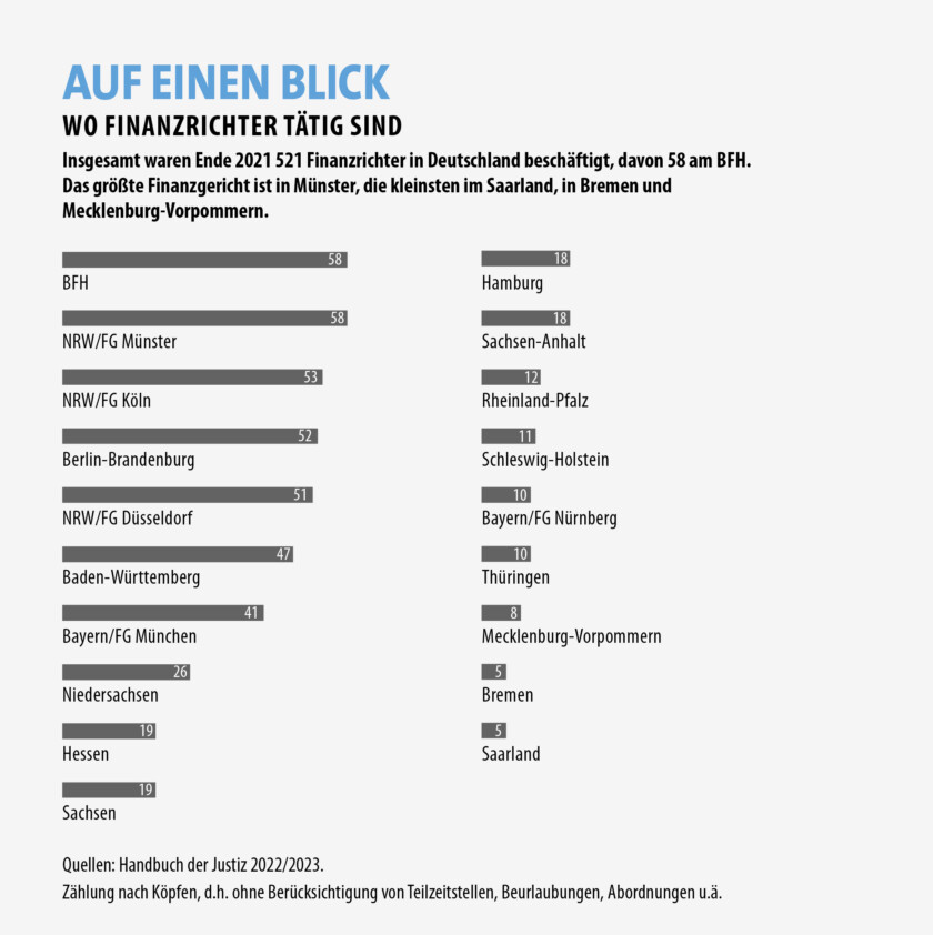 Dieses Ergebnis hat vor allem zwei Gründe. Zum einen können Steuerjuristinnen und -juristen in der freien Wirtschaft, vor allem aber in Steuerberatungsgesellschaften und Wirtschaftskanzleien, schlicht wesentlich mehr Geld verdienen. Zum Vergleich: Während Berufseinsteiger in vielen Rechtsanwaltskanzleien mittlerweile ein Gehalt von 100.000 bis zu 150.000 Euro verdienen, fangen Richter in Finanzgerichten in der Besoldungsgruppe 2 mit einem Salär von rund 60.000 bis 65.000 Euro an.