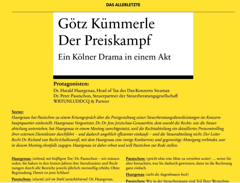 Haargenau hat Passtschon zu einem Krisengespräch über die Preisgestaltung seiner Steuerberatungsdienstleistungen ins Konzernhauptquartier einbestellt. Haargenaus Vorgesetzter, Dr. Dr. Jens Jetztschau-Genauerhin, dem sowohl die Rechts- wie die Steuerabteilung unterstehen, hat Haargenau in einem Meeting zurechtgestutzt, weil die Rechtsabteilung ein detailliertes Preiscontrolling ihrer externen Dienstleister durchführt – und dadurch angeblich effizienter einkaufe – und die Steuerabteilung nicht. Der Leiter Recht Dr. Richard van Recht-Ichallesweiß, mit dem Haargenau eine innige Konkurrenz und gegenseitige Abneigung verbindet, war in diesem Meeting ebenfalls zugegen. Haargenau ist daher erbost und will Passtschon zur Rede stellen.